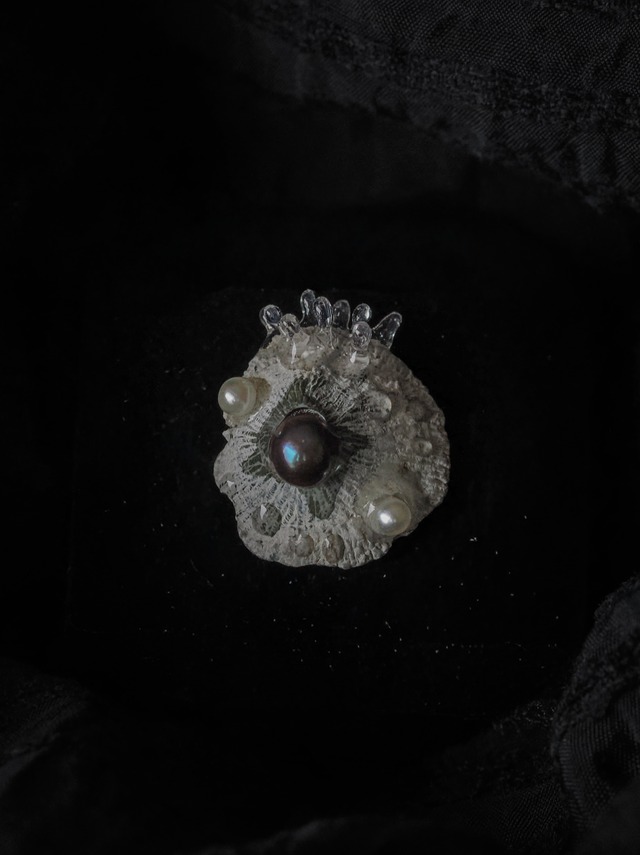 貝殻やフジツボを使い オブジェを仕立てるように、アクセサリーを作りました。 森を歩き、足元の小さな世界を覗いていると、 ふと海の中の景色と重なることがあります。 珊瑚のようなきのこ。イソギンチャクのような粘菌。 その間をゆっくりと進むカタツムリもまた、「陸貝」。貝の仲間です。 森の景色の中に、遠い海を重ねて。 ミクロコスモスを閉じ込めたアクセサリーシリーズです。 サイズ:約w2.2cm×h1.7cm リングサイズ:フリーサイズ(最少サイズ約9号のものを使用) リングパーツ素材:真鍮、電気メッキ