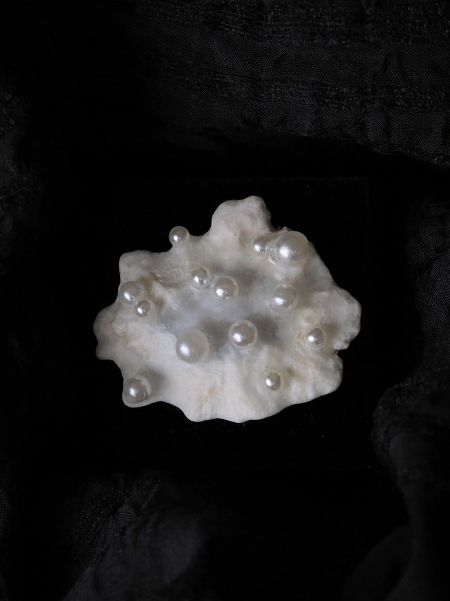 貝殻やフジツボを使い オブジェを仕立てるように、アクセサリーを作りました。 森を歩き、足元の小さな世界を覗いていると、 ふと海の中の景色と重なることがあります。 珊瑚のようなきのこ。イソギンチャクのような粘菌。 その間をゆっくりと進むカタツムリもまた、「陸貝」。貝の仲間です。 森の景色の中に、遠い海を重ねて。 ミクロコスモスを閉じ込めたアクセサリーシリーズです。 サイズ:約w3.9cm×h3.4cm