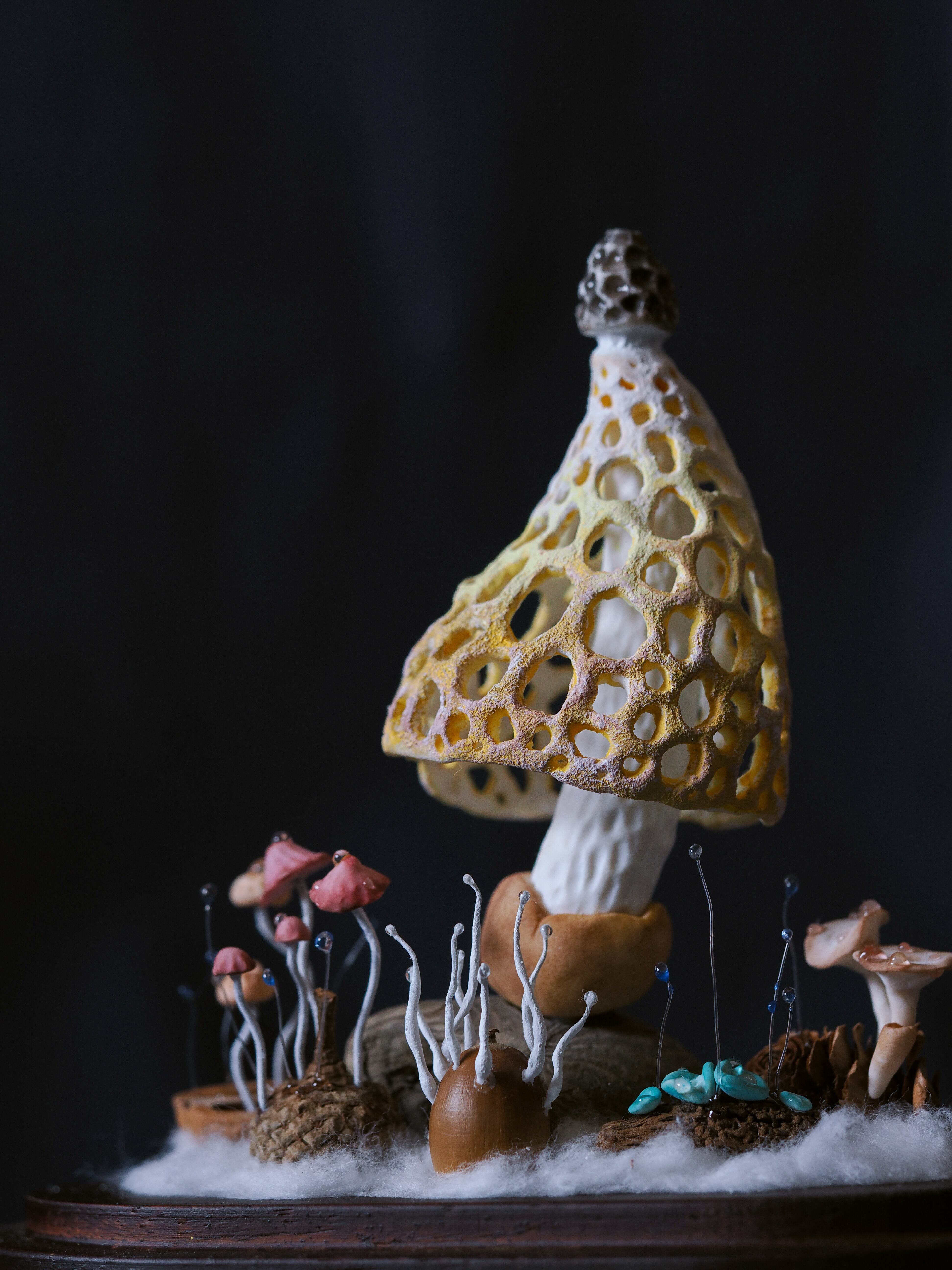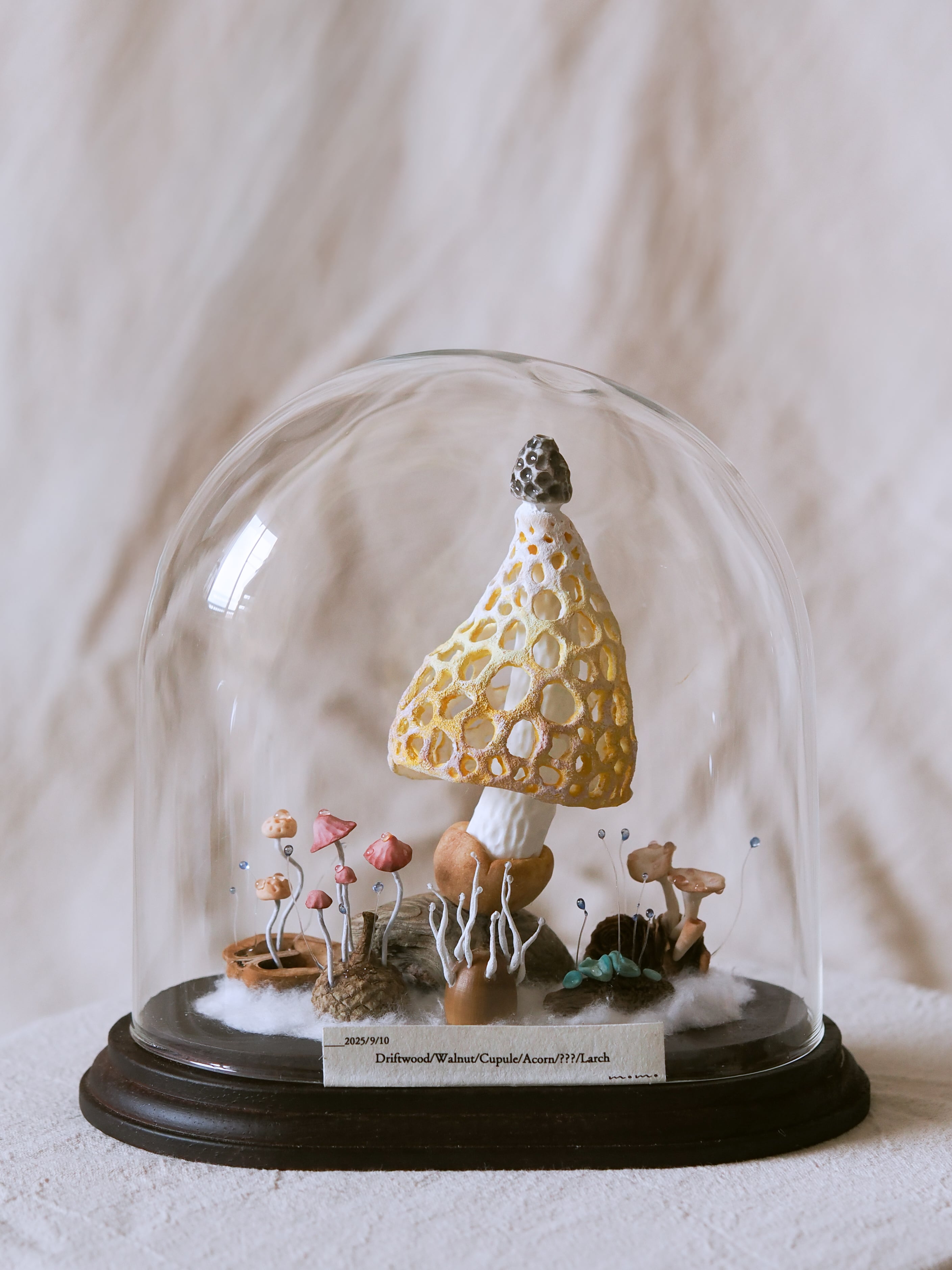 ちいさな木の実からはえる菌類たちが囲み、崇めている様子をガラスドームに納めました。